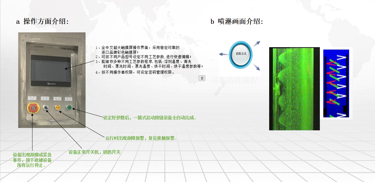 1、全自动清洗模式:网板上下抛动,同时加温的清洗液通过喷淋臂高压对等喷射,自动清洗、漂洗烘干全工序;