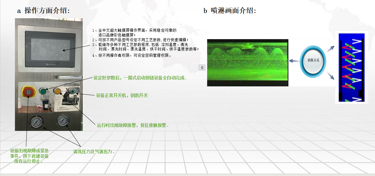 7、清洗、漂洗采用在线独立的内置过滤系统、独立的电动泵、独立的喷淋臂、独立的喷嘴,溶剂的循环7、使用,防止清洗和漂洗尽少串液,可提升漂洗水使用寿命,减少溶剂用量;
